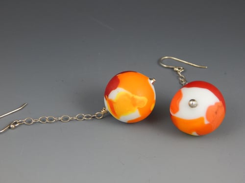 A pair of one-of-a-kind earrings from my Abstract Art Series. Blown hollow beads are layered with colored shards of glass inspired by abstract paintings. Each bead is made individually at my torch and then kiln annealed for strength and durability.